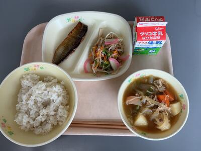ごはん・牛乳・ヤシオマスの塩焼き・切り干し大根の煮物・のっぺい汁です。