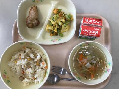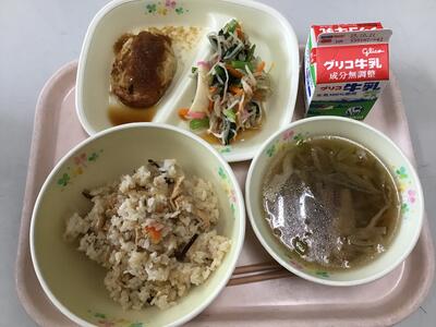 ★9日・・五目鶏飯・牛乳・豆腐ハンバーグ・ポン酢和え・沢煮椀