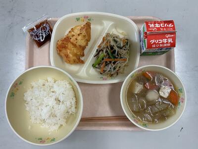 今日は、白米・牛乳・かしわ天ぷら(天丼のたれ)・無限もやし・けんちん汁です。