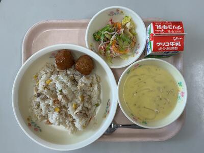 上段・・チキンピラフ・牛乳・肉団子・野菜サラダ・コーンスープ