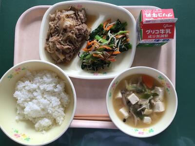 ★8日・・麦ごはん・牛乳・さばの味噌煮・無限もやし・芋の子汁・月見デザート